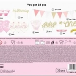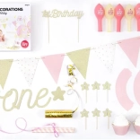 “One” banner (1 pc), paper garland (1 pc), cupcake toppers (6 pcs), light pink cupcake wrappers (6 pcs), cake topper (1 pc), straws (10 pcs), balloons mixed designs (6 pcs), gold streamers (1 pc), light pink satin ribbon 6 mm (1 pc)