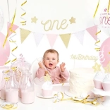 A stylish birthday decoration set in an elegant rose‑gold combination for a first birthday. Includes everything you need for a quick, coordinated setup – from a “One” banner and a paper garland to balloons, a cake topper, cupcake toppers and wrappers, straws, gold streamers, and a satin ribbon. Everything is conveniently packed in a box.