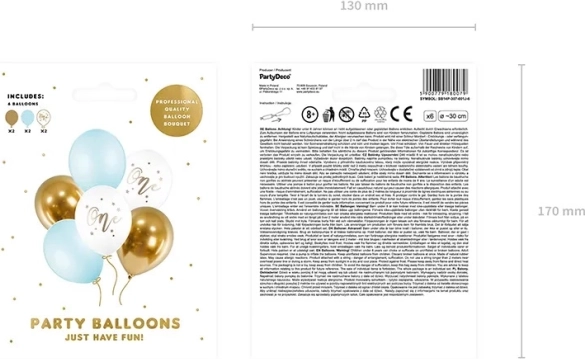 Stylish set of birthday balloons with the One print in a mix of pastel light blue, pure white and shiny gold. Ideal for a first birthday, diameter 30 cm, pack of 6 pieces.