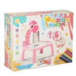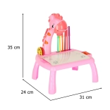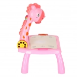 A fun pink giraffe table with a projector that projects templates onto the drawing surface, so kids can easily trace and color. Includes 3 interchangeable reels with themes, 12 colored markers, a drawing booklet, and a wipe-clean mat. Great for developing fine motor skills and creativity in children aged 3+.