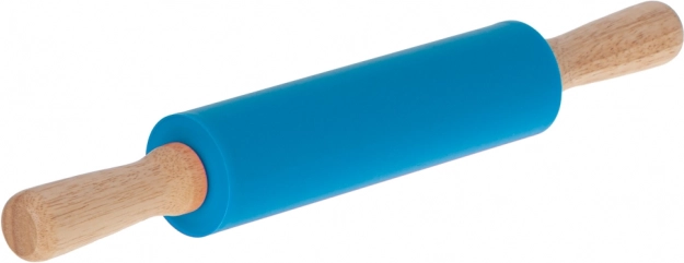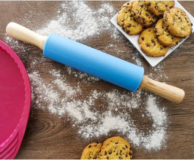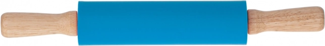 Blue silicone rolling pin for dough with wooden handles, 38 cm. Practical, easy to clean, modern design.