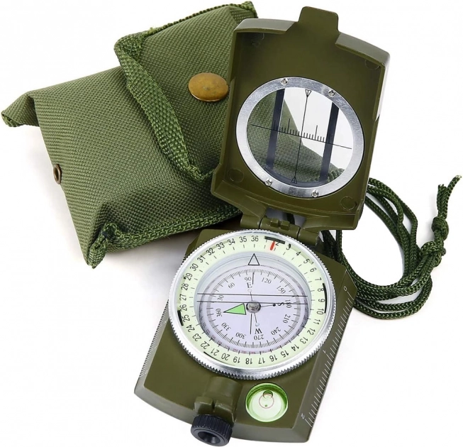 Professional prismatic compass for hiking, camping, and outdoor navigation. Thanks to its liquid-filled capsule, it shows direction quickly and stably, features a metal case for durability, a 5 cm ruler for map work, and the option to wear it around your neck.