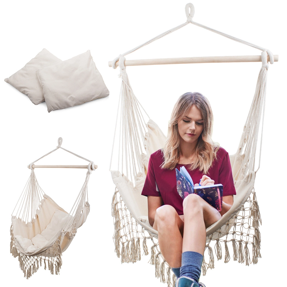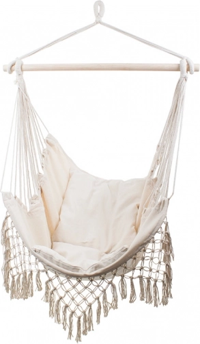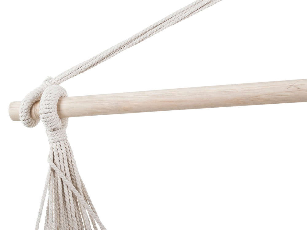 This stylish Brazilian-style hammock chair turns your balcony, terrace, or living room into a peaceful oasis. The durable fabric made of thick cotton with a polyester blend feels pleasant to the touch, is breathable yet strong. The wide wooden bar keeps the seat open, increases stability, and prevents twisting.