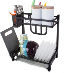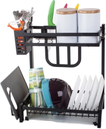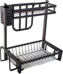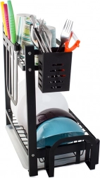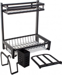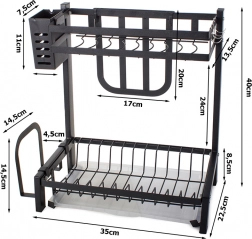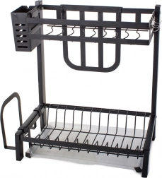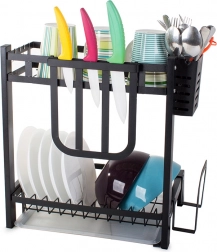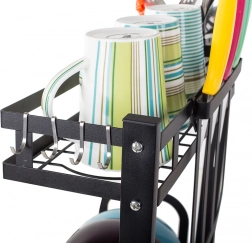 This rack offers ample space for 11 plates, bowls, mugs, and glasses. It comes with a hanging cutlery organizer, a dedicated organizer for large kitchen knives, and a shelf for cutting boards, all of which can be mounted anywhere on the frame. In addition, it has 4 hooks for towels and larger kitchen utensils.