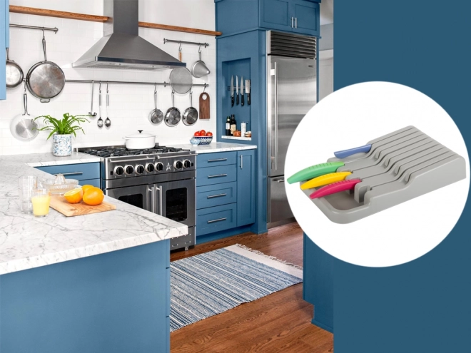 The knife organizer for drawers is a great choice for both modern and traditional kitchens. Made of durable plastic in an elegant gray color, it ensures long-lasting use. Its compact dimensions easily fit into any standard kitchen drawer, optimizing space.