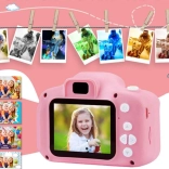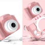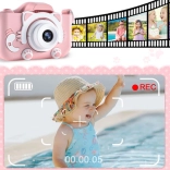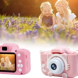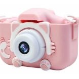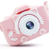 The camera features a pink kitten-shaped design with ears and paws that instantly captivates kids.
