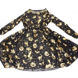 Élégant déguisement de sorcière de couleur dorée comprenant une robe et un chapeau, idéal pour le carnaval, les bals masqués et Halloween. Disponible en tailles S, M, L.