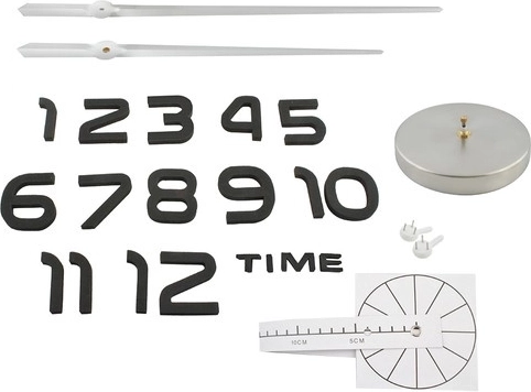 - Chiffres et inscription 3D, caches miroir, mécanisme d’horloge avec aiguilles, gabarit de montage en papier, crochets
