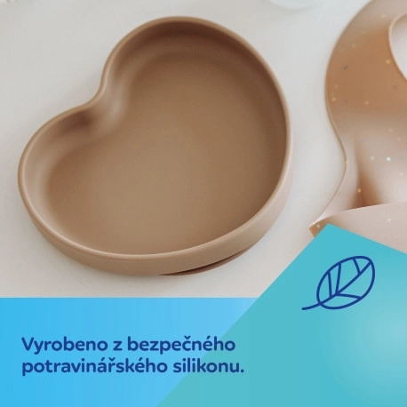 Assiette pour enfant élégante en silicone sûr avec une ventouse pratique en forme de cœur. Tient fermement sur la table, idéale pour les premières purées et le BLW, résistante et flexible, compatible lave-vaisselle et micro-ondes et sans BPA.