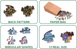 L’emballage contient un modèle séparé pour faciliter l’assemblage, le tout rangé dans une boîte en papier écologique. Le puzzle est fabriqué en panneau de fibres de bois HDF robuste de 3 à 4 mm d’épaisseur.