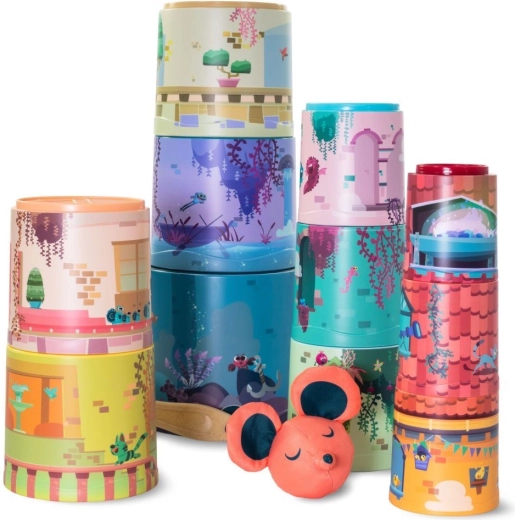 11 gobelets ludiques - assortis aux illustrations, les gobelets peuvent être empilés du plus grand au plus petit, l’un sur l’autre, pour créer une immense tour pleine d’histoires.
