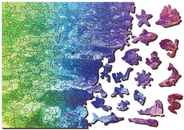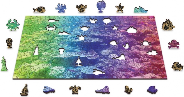 Le puzzle en bois Récif corallien 2‑en‑1 offre une expérience d’assemblage unique : d’un côté, vous assemblez selon le motif coloré, de l’autre selon les formes avec un motif répétitif. Une partie des pièces présente des formes originales d’animaux, d’objets ou de bâtiments et, grâce aux détails soulignés au laser, elles ressemblent à de petites figurines autonomes.