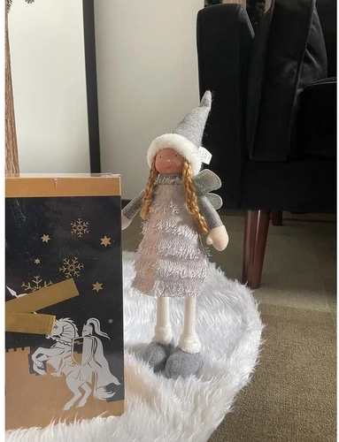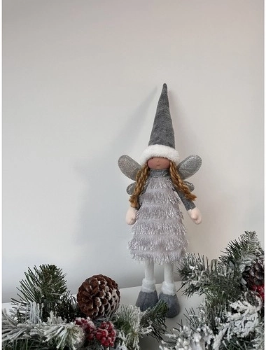 Cette élégante figurine de Noël fée/ange, en gris, blanc et argent, apporte à la maison une atmosphère hivernale chaleureuse. Les ailes scintillantes et les textiles doux créent un effet de magie et de joie typique des fêtes.