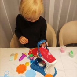 La boîte contient 5 pots de pâte à modeler de différentes couleurs, qui peuvent être mélangées entre elles pour créer de nouvelles nuances. L’ensemble d’outils complet (couteau, fourchette, cuillère, assiettes, gobelets et différents embouts) soutient le jeu créatif, le développement des compétences et le jeu de cuisine amusant.