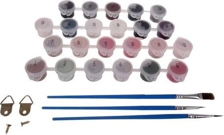 Le set est complet et prêt à peindre : la toile est déjà tendue sur un châssis en bois, le coffret inclut 3 pinceaux pour différents détails, des crochets et vis de suspension ainsi que des crochets sans traces. Idéal comme cadeau pour les esprits créatifs ou comme activité à partager avec vos proches.