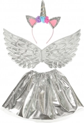 Ce superbe costume permet de transformer votre enfant en une licorne unique. Il se compose d’une jupe argentée, d’ailes élégantes et d’un serre-tête finement orné de petites roses. Idéal pour toutes les occasions où l’enfant peut s’amuser dans un univers féerique.