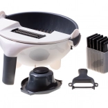 Grâce à cet ensemble, préparez facilement des frites, une salade de concombre, du fromage râpé ou des pommes pour une tarte. La râpe peut être placée confortablement sur le bol et l'accessoire approprié peut être choisi de sorte que les produits râpés ou tranchés tombent directement dans le bol.