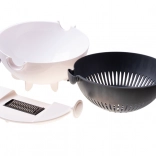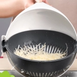 La passoire rotative simplifie le travail en permettant un drainage immédiat de l'eau excédentaire après la découpe. Elle peut également être utilisée pour égoutter les pâtes ou la salade. La râpe est équipée d'une poignée avec des piques qui protègent les doigts des coupures.