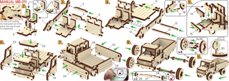 Les pièces prédécoupées en contreplaqué de qualité s’emboîtent parfaitement. Le tout est accompagné d’un mode d’emploi illustré clair, idéal même pour les débutants.