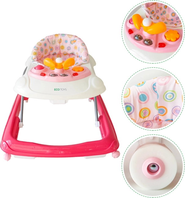 Le trotteur pour enfants ECO TOYS rose soutient le développement naturel de la motricité grâce à son panneau interactif et sa construction stable. Les roulettes avant pivotant à 360° assurent des déplacements fluides, tandis que les roulettes arrière en silicone empêchent la marche arrière. Le cadre de stabilisation inférieur minimise le risque de basculement pour que votre enfant puisse se concentrer en toute sécurité sur ses premiers pas.