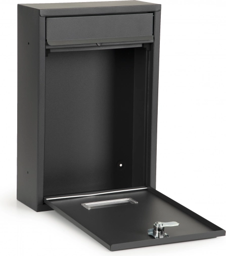 La boîte est fabriquée en acier galvanisé, ce qui garantit une protection complète contre la corrosion. La partie inférieure comporte un emplacement dédié aux journaux et prospectus, séparant votre correspondance des supports publicitaires.