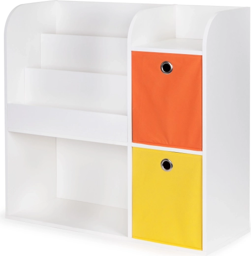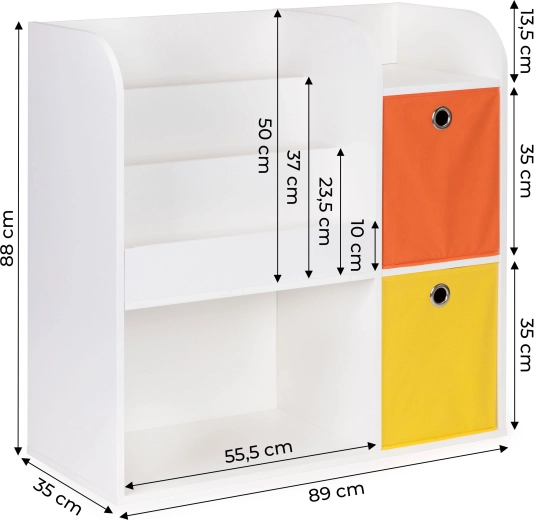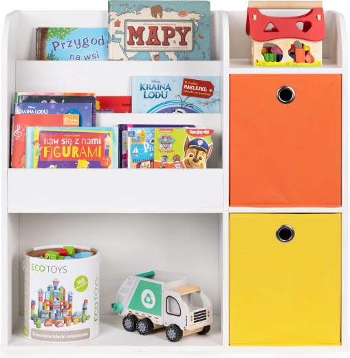 Le meuble est fabriqué en panneau de particules résistant et fini avec une placage résistant aux dommages. Les compartiments profonds accueilleront vos livres, albums, cahiers de coloriage et magazines préférés, et les étagères seront idéales pour ranger les jouets. Le set comprend en plus 2 paniers textiles spacieux, idéals pour les blocs et autres accessoires.