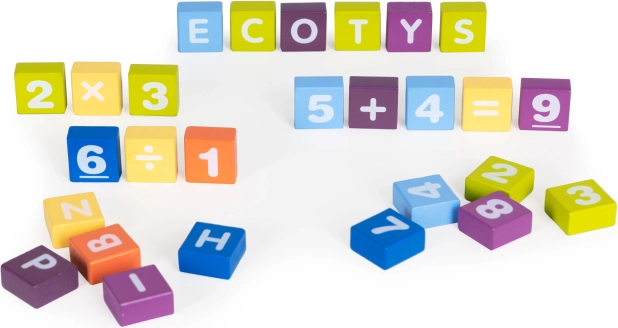Grâce aux lettres, chiffres et symboles imprimés, les enfants acquièrent en douceur les bases de l’alphabet et des mathématiques tout en construisant leurs premières structures.