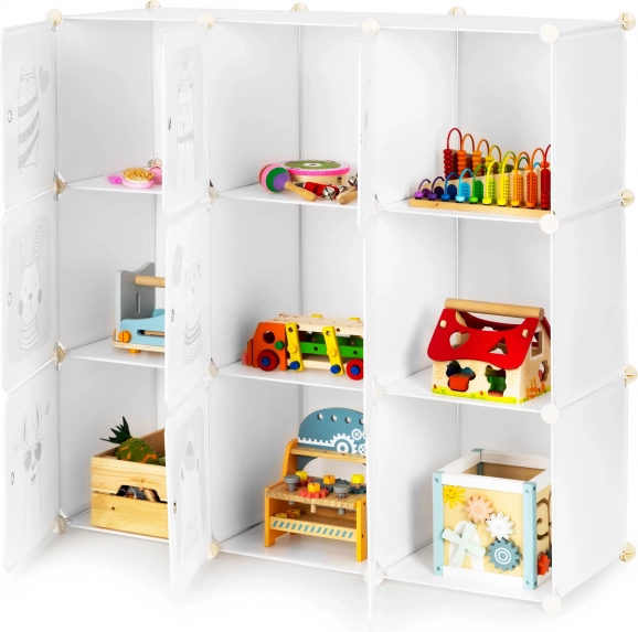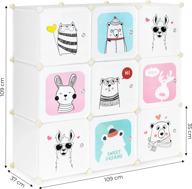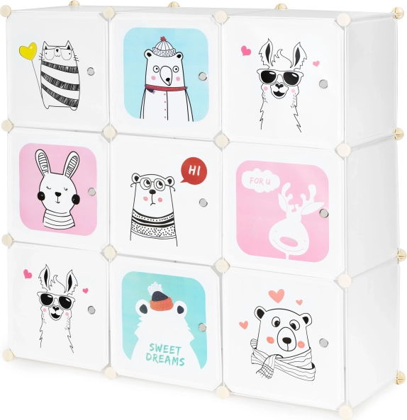 Cette armoire modulaire pour enfants apporte de l’ordre et une touche ludique à la pièce. Neuf cubes séparés avec portes faciles à ouvrir accueillent jouets, livres et vêtements, tandis que les illustrations colorées d’animaux rendent l’espace plus chaleureux et stimulent l’imagination. Sa construction légère est sûre pour les enfants et leur permet de garder la chambre en ordre de manière autonome.