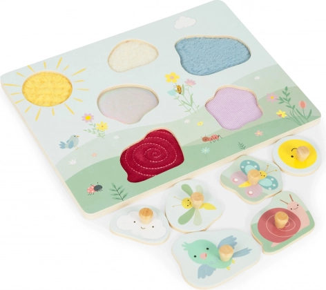 Sous chaque pièce se cache un matériau différent. L’enfant explore diverses textures par le toucher, renforçant ainsi la perception tactile, l’attention et la curiosité lors des découvertes sensorielles.