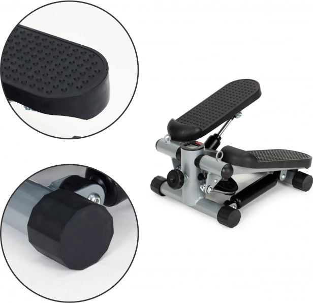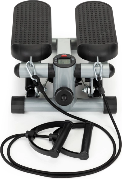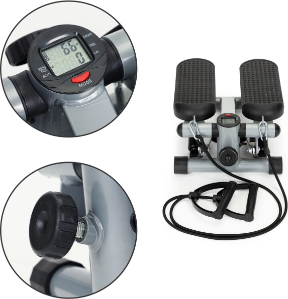 Créez un entraînement cardio et de renforcement efficace directement chez vous. Ce mini stepper combine un mouvement fluide avec une résistance hydraulique, des marches antidérapantes confortables et des bandes de résistance avec poignées souples pour activer le haut comme le bas du corps. L’écran intégré suit clairement le temps, les pas, les pas par minute, les calories ainsi que le mode SCAN.