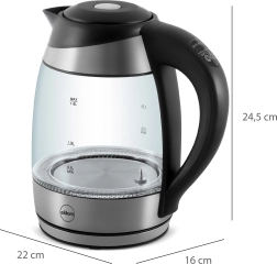 La bouilloire offre une capacité de 1,8 l, une ébullition minimale dès 0,5 l et un fond chauffant couvert pour un nettoyage facile. Le récipient en verre avec éclairage LED, la base 360° pivotante, le filtre amovible et l’indicateur de niveau d’eau augmentent le confort au quotidien. Une triple protection contre la surchauffe, les surtensions et le fonctionnement à sec assure une utilisation en toute sécurité.