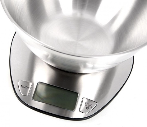 Le bol en acier inoxydable est amovible, ce qui permet de transférer facilement les ingrédients pesés. La balance propose en outre la fonction tare et la possibilité de mesurer le volume de l’eau et du lait en litres.