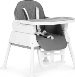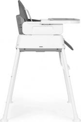 La chaise est réglable en hauteur. Vous pouvez facilement retirer les pieds et le repose-pieds, ainsi la chaise haute se transforme en chaise basse. Un atout unique est son siège que vous pouvez utiliser sur une chaise de salle à manger ou de cuisine. Le kit comprend des sangles spéciales de fixation pour l’assise et le dossier d’une chaise classique.