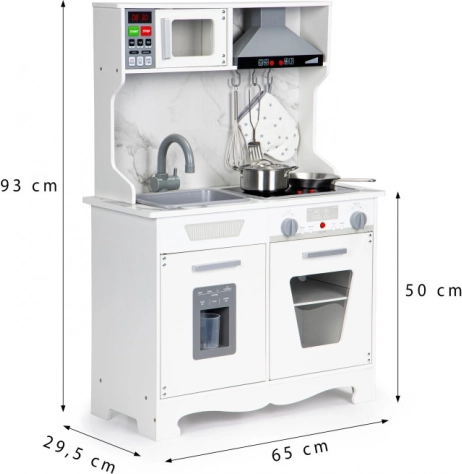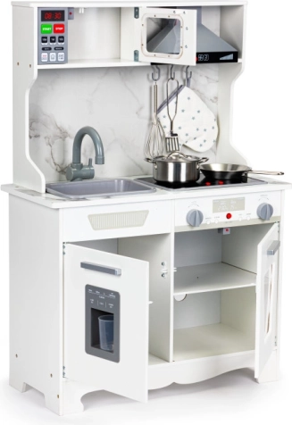 Cette cuisine en bois ECOTOYS est parfaite pour les petits chefs et offre une expérience réaliste grâce aux effets lumineux et sonores. Elle est équipée de placards ouvrables, d'un évier avec robinet et d'accessoires métalliques.