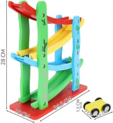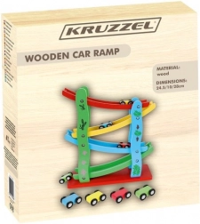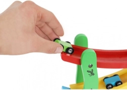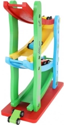 L'ensemble comprend une rampe en bois avec 4 pistes de couleurs différentes et 4 petites voitures. Tout est fabriqué en bois, ce qui garantit un niveau élevé de sécurité.