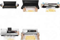 L’interface est intuitive – des programmes sont disponibles pour aliments secs/humides, soudure, réglage de la vitesse, marinade et aspiration via tuyau depuis des sachets et des récipients. L’équipement pratique comprend un bouchon pour la mise sous vide des bouteilles, un coupe-film et 9 rouleaux de film + 5 grands sachets, afin que vous puissiez emballer dès le déballage.