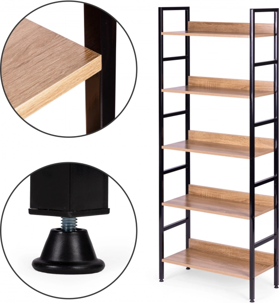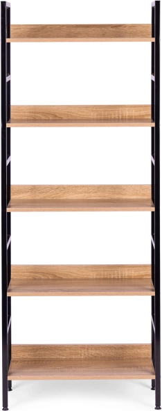 Les étagères sont fabriquées en panneau MDF revêtu d’un placage imitation bois. Leurs dimensions de 56 x 25,5 cm accueillent confortablement tous vos objets préférés. Le cadre de la bibliothèque est en métal peint par poudrage et ses pieds sont munis de patins spéciaux pour protéger le sol.