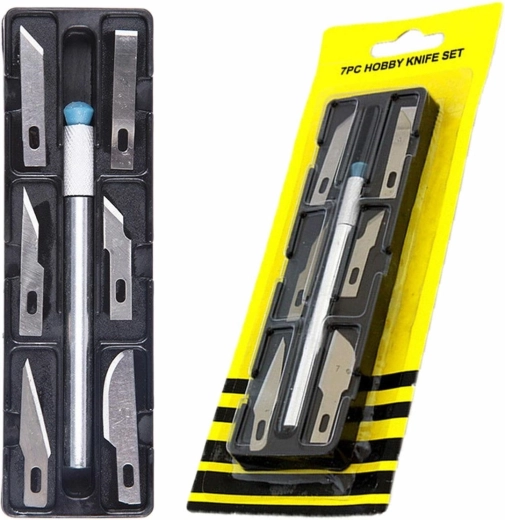 Scalpel de précision et set de lames pour les travaux de modélisme et de bricolage. Comprend six lames de formes différentes et une poignée ergonomique, le tout dans un étui pratique.