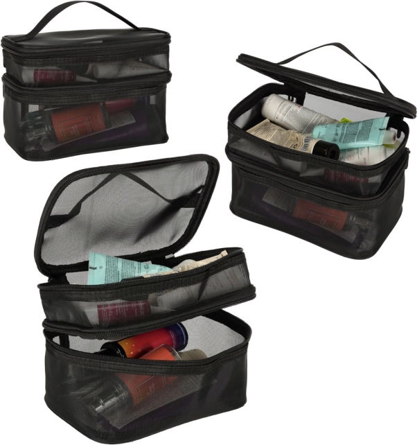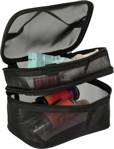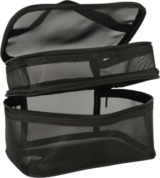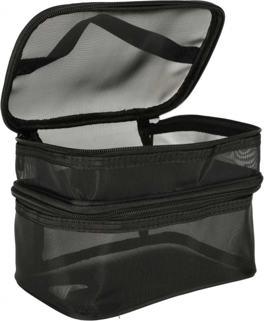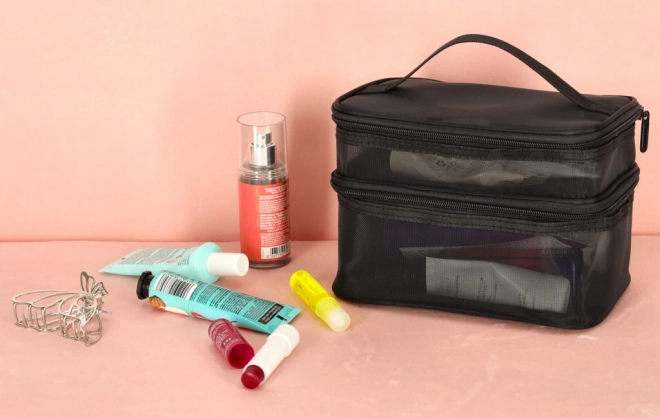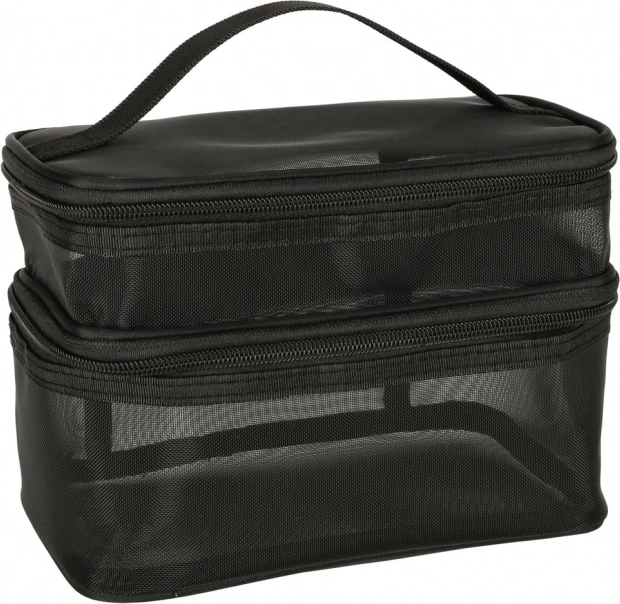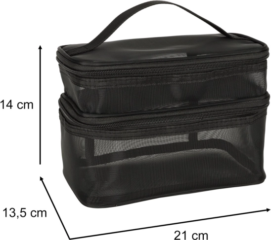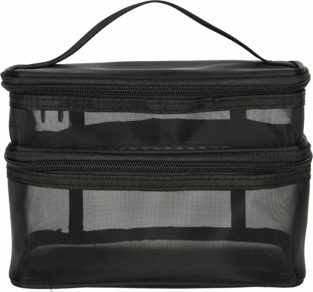 Pratique trousse de toilette noire, idéale aussi bien pour les voyages que pour un usage domestique. Elle est équipée de deux compartiments permettant une organisation facile des produits de beauté. Fabriquée en matériau maillé respirant, qui offre une vue rapide sur le contenu. Une poignée pratique assure un transport aisé.