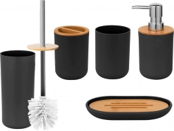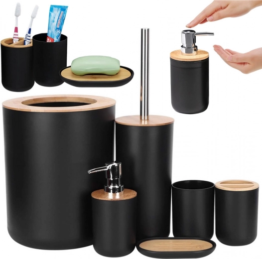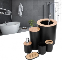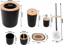 Élégant, le set de salle de bain 6 en 1 est un choix idéal pour les intérieurs modernes. Chaque élément est fabriqué avec le sens du détail, et la combinaison de noir mat et d’éléments en bambou apporte non seulement une valeur esthétique, mais aussi fonctionnalité et facilité d’entretien. L’ensemble comprend une poubelle, une brosse WC, un distributeur de savon, un porte-savon, un gobelet pour brosses à dents et un gobelet de rinçage.