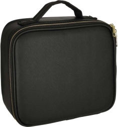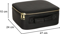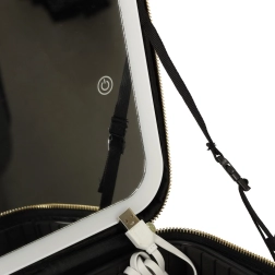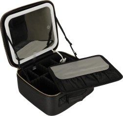 Élégante trousse de toilette noire pour garder votre équipement parfaitement organisé à la maison comme en déplacement. À l’intérieur, vous trouverez des cloisons réglables, une poche pour pinceaux ou rouges à lèvres et un rembourrage résistant qui protège le contenu. Le miroir LED intégré avec trois modes d’éclairage et capteur tactile assure un maquillage précis partout.