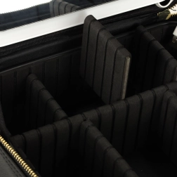 Agencement modulable des compartiments et poche pour pinceaux ou rouges à lèvres pour un ordre parfait en voyage.