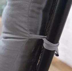 Partie plissée spéciale sur le dossier et cordons de fixation garantissant que le coussin reste fermement en place.