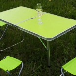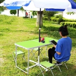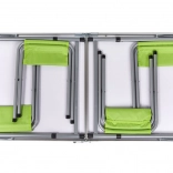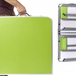La table propose trois niveaux de hauteur (55 / 62 / 70 cm), pour s’adapter facilement aux repas, aux jeux ou au travail en plein air. Le trou pour parasol (env. 2,5 cm) apporte de l’ombre lors des journées chaudes. Une fois plié, l’ensemble devient une mallette compacte avec poignée pour un transport facile et un gain de place dans la voiture ou le camping-car.