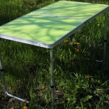 La table se règle sur trois hauteurs (55 / 62 / 70 cm). La structure en aluminium avec embouts antidérapants assure la stabilité même sur des surfaces moins régulières.