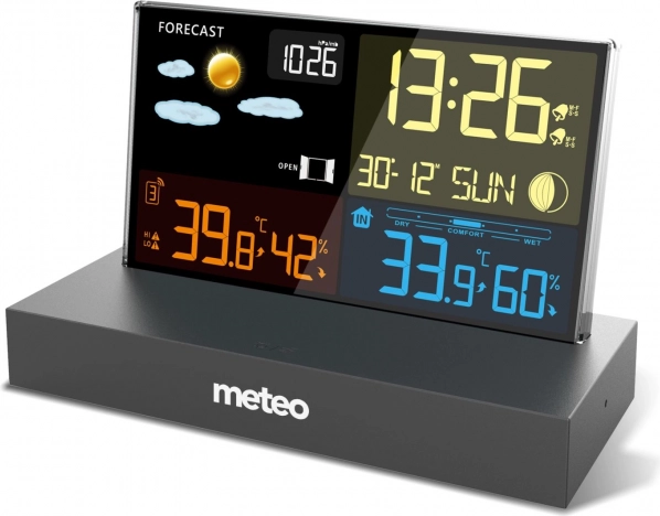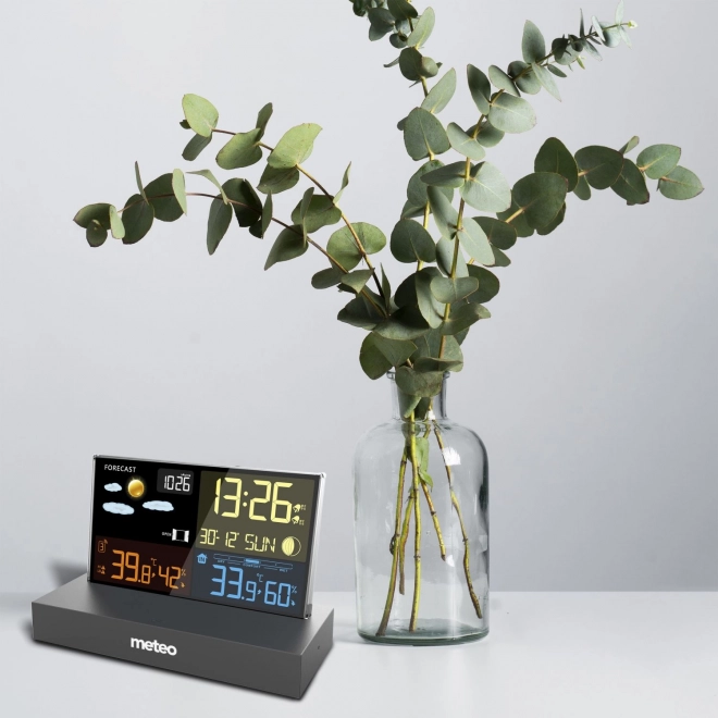 La station météo METEO SP110C offre une vue d’ensemble complète de la météo et du climat domestique. Le capteur sans fil transmet les données de température et d’humidité jusqu’à 60 m de distance, l’écran couleur avec icônes claires affiche la prévision sur 12–24 heures, les phases de la Lune ainsi que la tendance de la pression via le baromètre intégré. Grâce à l’horloge radiopilotée DCF, vous avez toujours l’heure exacte, et l’alarme avec fonction snooze rend chaque matin plus agréable.