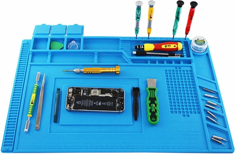 Tapis de service multifonction antistatique en silicone. Un outil indispensable pour tout bricoleur amateur ou professionnel. Il facilite grandement toutes les réparations électroniques et les travaux de soudure. Résistant aux hautes températures (jusqu’à 500 °C) et à la déformation. Il dispose de 4 zones magnétiques pour aimanter les tournevis, pour les composants et les vis, ainsi que de nombreux compartiments et d’une règle linéaire en centimètres.