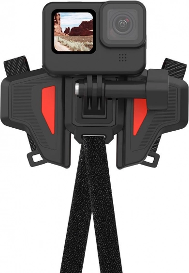Le support a la forme d’ailes de papillon, et les deux peuvent être repliées. Vous pouvez ainsi l’adapter encore mieux à la forme de votre casque. La fixation par Velcro permet un montage simple mais stable. La caméra se fixe à l’aide d’une attache robuste en acier inoxydable et nylon PA66.