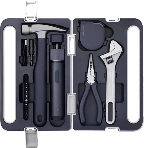 Pratique set d’outils de la marque Hoto, faisant partie de l’écosystème Xiaomi, comprenant 9 outils utiles, dont un tournevis sans fil, un marteau avec poignée en caoutchouc et une clé réglable. Le tout est rangé de manière pratique dans un coffret à outils robuste, assurant une manipulation et une portabilité aisées.