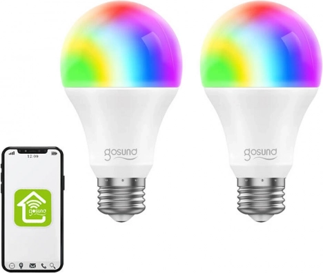 Ampoules LED RGB Wi‑Fi intelligentes GOSUND WB4 E27 (2 pcs) : 16 millions de couleurs, 2700–6500 K, 800 lm, 8 W, contrôle dans l’application Tuya, Alexa et Google Assistant.